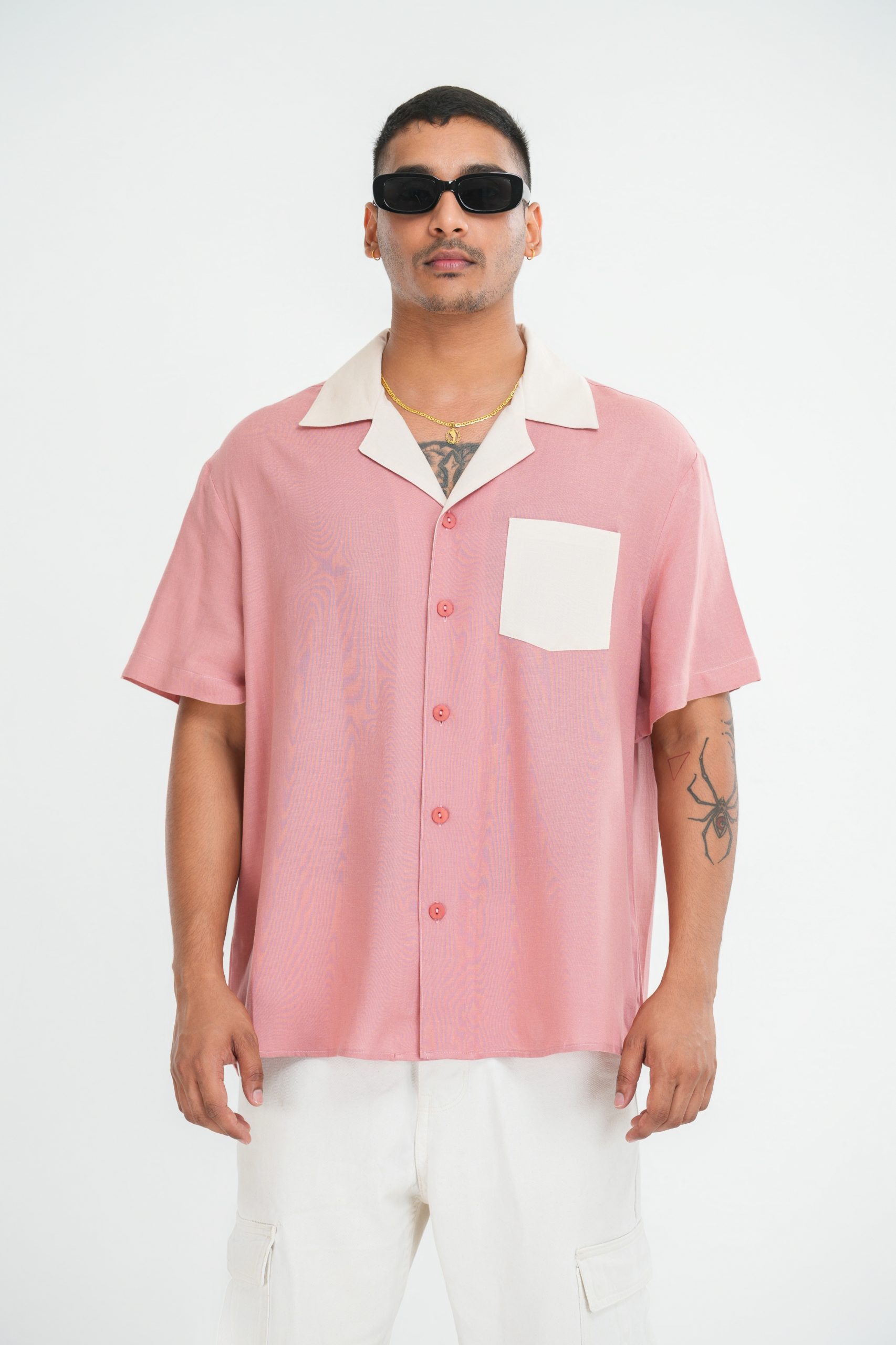Pink Cuban collar linen shirt with off-white pocket and collar accents. Breathable fabric and vintage-inspired design combine effortless elegance with bold modern style—perfect for warm-weather sophistication.